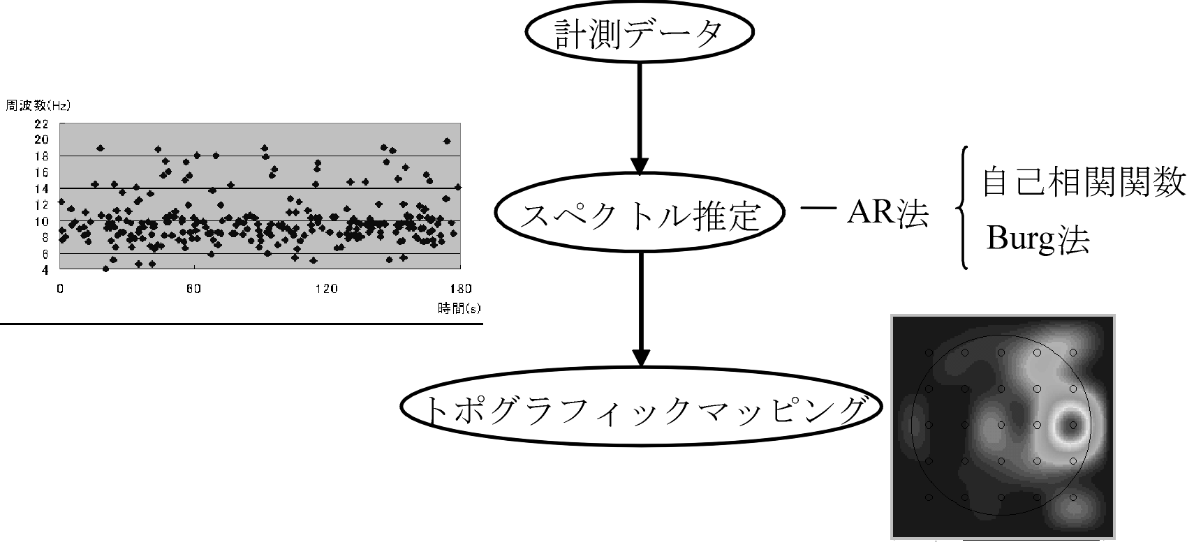 本システムの信号処理は図1のような手順で行われている. 計測された各チャネルのデータに対し,自己相関関数を用いてセグメンテーションを行い,その各部分に対してAR法で周波数スペクトルを求める.さらにこれを用いて,各周波数帯域に対してトポグラフィック・マッピングでの脳の活動領域の可視化も行う.